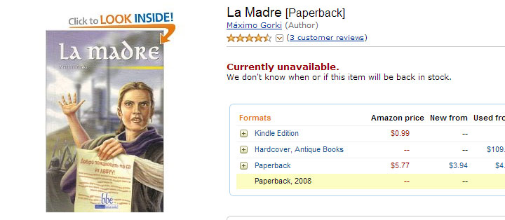 Еще один казус с обложкой на Amazon.com. В этот раз "пострадал" испанский перевод книги Максима Горького "Мать". Присмотритесь внимательно к обложке! Скрытая реклама? Справедливости ради, стоит отметить, что внутри самой книги представлена другая обложка. Непонятно, шутка ли это такая, продакт плейсмент или очередной "fail", подобный тому, что когда-то случился с книгами Ф.М. Достоевского.