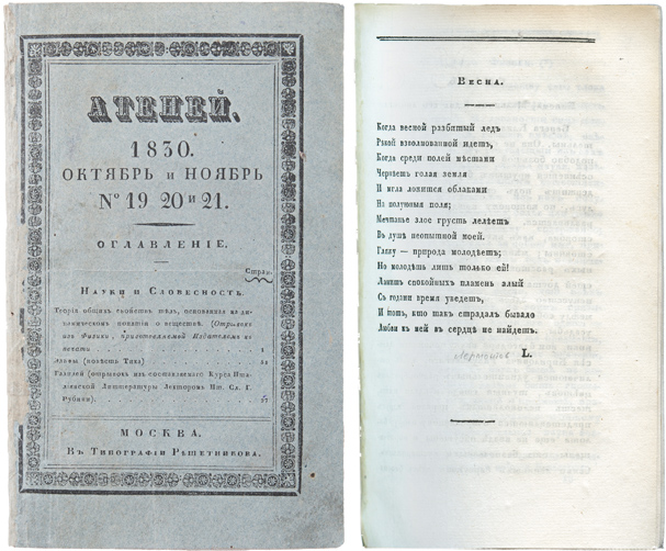 Первое напечатанное стихотворение Михаила Лермонтова «Весна» будет выставлено на аукцион «Старинные и редкие книги, карты, гравюры». Торги пройдут 23 апреля в ЦДХ. Об этом сообщил на своем сайте аукционный дом «Кабинетъ».
