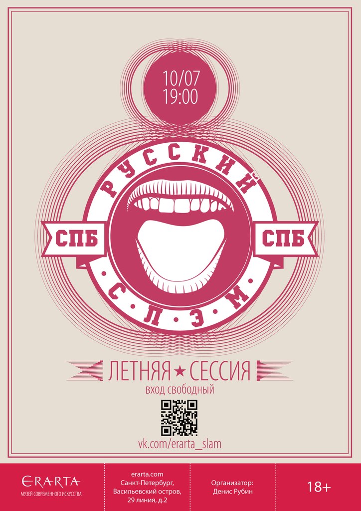 10 июля в 19.00 - очередной летний забег поэтического конкурса Русский Слэм СПб. В этом поэтическом состязании по практически спопртивным правилам может попробовать свои силы любой желающий из пишущих стихи. История слэма в Петербурге насчитывает более десяти лет. Начинались эти поэт-баталии еще в подвале Бродячей собаки при полной и безоговорочной поддержке автора идеи писателя Вячеслава Курицына. И вот уже много лет с постоянной и завидной регулярностью они проходят на разных площадках города. Последние три года Слэмы проводятся в музее Эрарта.