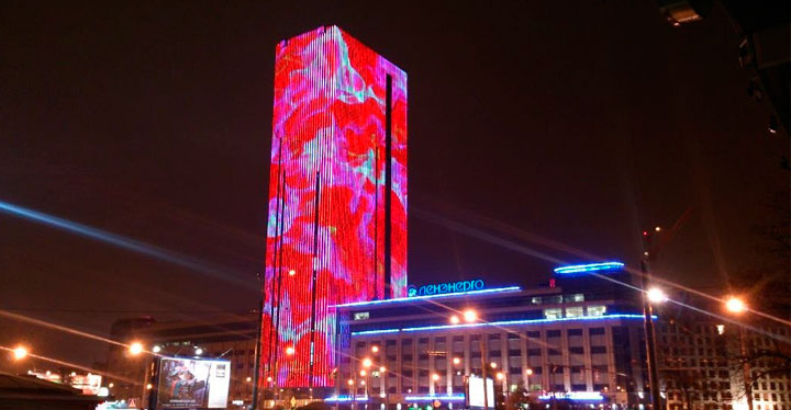 Здание LEADER TOWER имеет уникальный фасад, который с наступлением темноты превращается в мультимедийный экран, способный воспроизводить изображения и анимацию. Использовать его для размещения стихотворения - замечательная идея! Надеемся, что и в будущем будут проходить подобные акции. Современному искусству - современное обрамление!