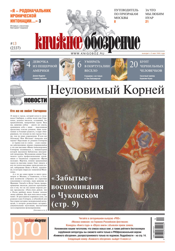 «Книжное обозрение» – еженедельная газета о книгах и книгоиздании. Всё самое интересное из мира литературы: фантастика, детективы, беллетристика, бестселлеры. Российские и зарубежные новости литературы, критика, обзоры, интервью с писателями, заметки о литературной жизни, рейтинги продаж. «Книжное обозрение» – все, что вы хотите знать о книгах! Читайте в номере: Девочка из пещерной Америки Дэниэл Вудрелл о нравах глубинки Умирать в Португалии весело Страшилки и не только от Леи Любомирской Бунт чернильных человечков Сказочный триллер Корнелии Функе Неуловимый Корней «Забытые» воспоминания о Чуковском Персона: Виктория Токарева «Писатель – он чуть-чуть проповедник…» Литжизнь А. Волгина. Имени Гончарова Ж. Перковская. Если бы Пьер Безухов… Клуб: детлит В. Бройде. В Египте выпал снег Клуб: кино и книга В. Бройде. Черная серия и многое другое