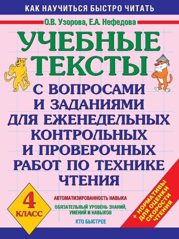 В пособии приведено 32 текста с контрольными вопросами, определенным количеством слов и нормативами оценки техники чтения для еженедельных и контрольных работ в 4 классе. Скорость чтения – это количество слов, прочитанных за 1 минуту. Ученик должен читать выразительно, не меняя темп чтения, соблюдая знаки препинания, четко проговаривая слова. После каждого текста даны контрольные вопросы, которые позволяют проверить, насколько осознанно школьник воспринимает прочитанное, а также нормативы, которые учитель может использовать для объективной оценки навыков чтения учащихся. Количество слов в текстах дано в скобках. Нормативы скорости чтения для 4 класса: в конце первого полугодия 95–100 слов в минуту; в конце второго полугодия 110–120 слов в минуту. Чтобы отработать навык чтения, необходимо каждую неделю проводить проверку скорости чтения. При методически правильно поставленном процессе обучения ученик способен достичь этих результатов и даже превзойти их. Пособие адресовано учителям и родителям.