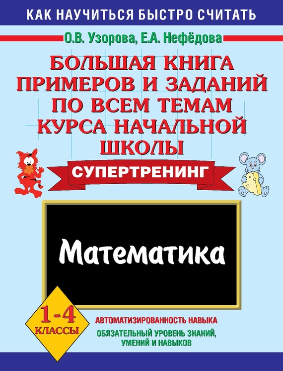 Перед вами уникальное пособие по обучению школьников навыкам устного счёта. В нём объединены примеры и задания по всем темам курса математики для начальной школы. Пособие содержит 16 разделов, каждый из которых посвящён отдельной теме. Раздел состоит из трёх частей: Примеры для отработки навыков счёта на скорость. На странице приведено 3-5 столбиков в среднем по 35 примеров. В конце столбика записывается время, потраченное учеником на решение. В левом нижнем углу обозначены контрольные цифры: идеальное время решения одного столбика, удовлетворительное и результат, который должен заставить ученика задуматься. Как показывает практика, ученик полностью усвоил тему, если решает пример и записывает ответ в течение 4-7 секунд. В этом случае считается, что навык счёта доведён до автоматизма. Контрольные и проверочные работы. С их помощью учитель быстро оценит полученные учениками навыки вычислений и выявит «слабые» места. Логические примеры. Выполнение этих заданий развивает логическое и математическое мышление, память и внимание. По усмотрению учителя примеры можно использовать как для олимпиадных работ и заданий повышенной сложности, так и для повторения и закрепления пройденной темы. Пособие рекомендуется в качестве дополнительного материала на уроках математики, а также для занятий дома.