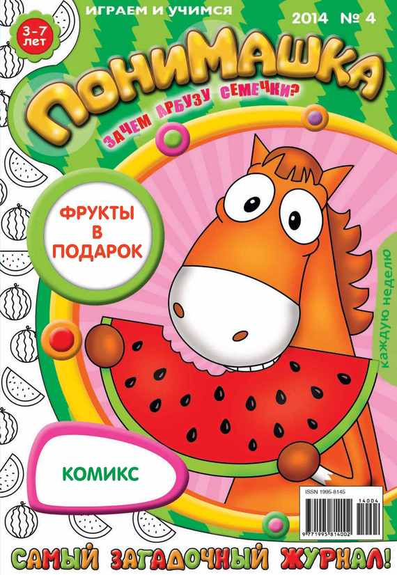 «ПониМашка» – развлекательный журнал для детей от 4 до 7 лет. Направлен на развитие творческих способностей и внимания ребенка. Содержит интересные задания для ребят, в игровой форме обучающие грамоте, математике, логике. На страницах журнала дети могут рисовать, решать сканворды, раскрашивать, играть в настольные игры и разгадывать ребусы. Главный персонаж журнала, пони по имени Машка, путешествует по загадочным местам, знакомя детей с миром животных, птиц и даже вещей. Каждый выпуск – тематический. Тема текущего выпуска – «Зачем арбузу семечки?». Журнал поможет вашим детям отдыхать с пользой!