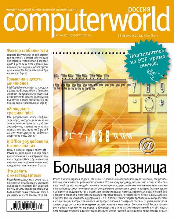 Computerworld Россия – ведущий международный еженедельник, посвященный информационным технологиям. В журнале вы найдете обзор важнейших событий ИТ-индустрии в России и в мире, материалы о новых технологиях. В номере: Большая розница Редко в какой отрасли задачи, решаемые с помощью информационных технологий, так разнообразны, как в области розничной торговли. Розничному продавцу, независимо от масштаба бизнеса, необходимо взаимодействовать с поставщиками, транспортными компаниями (или налаживать логистику самостоятельно), вести учет движения финансовых средств, товаров (причем как целых палет с продукцией, так и отдельных «составляющих» палеты), заботиться о физической безопасности товаров и посетителей в своих торговых точках, о сохранности персональных данных покупателей, их «захвате» и удержании и т. д. А также удовлетворять требованиям государственных инстанций, которые опять-таки интересует широкий спектр вопросов – от учета и контроля финансов до состояния инженерных систем складов и магазинов. Computerworld Россия поговорил с рядом крупных интеграторов, работающих на рынке автоматизации ретейла, чтобы прояснить текущее состояние дел в информатизации отечественной розницы и ее перспективы. Фактор стабильности Первые результаты новой стратегии Microsoft, которая обеспечила корпорации устойчивое развитие даже в условиях охлаждения экономики, уже видны, считает президент Microsoft в России Николай Прянишников. Трамплин в десять миллионов Intel Capital инвестирует 10 млн долл. в развитие бизнеса «Манго Телеком», эти средства предназначены для поддержки усилий «Манго Телеком» по выходу на европейский рынок облачных бизнес-приложений. «Холодная» графика Intel Intel разработала новое графическое ядро, которое должно повысить продолжительность работы смартфонов, планшетов и портативных компьютеров от батарей за счет уменьшения потребления энергии на 40%. К Office 365 добавили бизнес-анализ Новый онлайн-сервис Microsoft – Power BI, входящий в набор офисных приложений