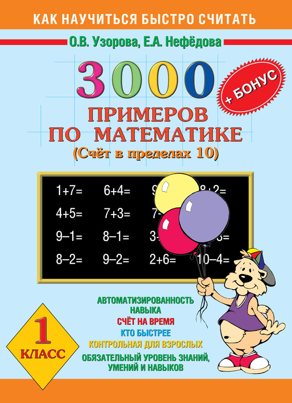 Пособие содержит 3000 математических примеров по теме «Счет в пределах 10». Оригинальное построение материала позволяет обеспечить более глубокое его усвоение. Как показывает практика, ученик полностью освоил программу, если решает и записывает ответ по истечении 4-7 секунд. В этом случае можно говорить, что навык счёта доведен до автоматизма. На каждой странице приведены 7 столбиков, в среднем по 40 примеров. В конце столбика записывается время. В нижнем левом углу обозначены контрольные цифры: идеальное время решения одного столбика, удовлетворительное и результат, который должен заставить ученика задуматься. Чтобы достичь отличных результатов, каждый день следует решать по одной странице. Для учеников, быстрее других выполнивших задание, а также для максимально эффективного усвоения темы в конце каждой страницы даны усложненные задания – «бонусы». Пособие может быть использовано на уроках математики, а также для работы дома.
