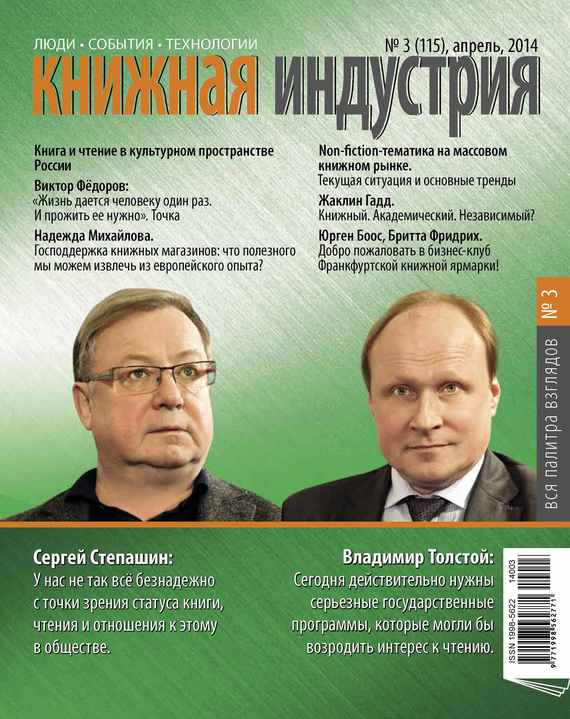 ние годы принципиально изменилась роль авторов: из поставщиков текстов они превратились в медийных персонажей, бренды, а то и, благодаря платформам самиздата, во вполне самостоятельные издательские единицы. И сегодня в рубрике «Электронная книга» читайте статью «Софт вам в помощь: компьютерные программы для писателей, ученых и сценаристов». Печатная книга и книжный рынок могут похвастаться многовековой историей, и перемены в них лишь отчасти меняют устоявшиеся правила игры в бумажном пространстве. Но если продукт совсем новый и рынок только создается? Как выстроить взаимоотношения с нуля? Кто и как устанавливает правила и уровень ответственности участников этого рынка? На эти непростые вопросы искали ответы участники круглого стола «Электронно-библиотечные системы: правила игры на рынке». Материал представлен в рубрике «Крупный план». Эту же рубрику продолжает интервью с президентом Ассоциации книгораспространителей независимых государств, генеральным директором ГУП ОЦ «Московский Дом Книги» Надеждой Ивановной Михайловой . Оно посвящено теме: «Господдержка книжных магазинов: что полезного мы можем извлечь из европейского опыта?» За пять лет наши путешествия по просторам России позволили рассказать истории из книжной жизни полусотни крупных и малых городов. И в 2014 году мы не собираемся нарушать традиции. Так что в дорогу! На повестке дня в рубрике «Регион» – Нижний Новгород. В центре внимания рубрики «Аналитика рынков» – «Non-fiction-тематика на массовом книжном рынке. Текущая ситуация и основные тренды». Предлагаем вашему вниманию подробный отчет об основных трендах российского рынка изданий прикладной тематики, построенный на аналитическом материале «Книжный рынок России – 2013–2014: статистика, тренды, прогноз». Рубрику продолжает информационный проект «Книжный рынок России – 2010–2015. Рейтинги продаж». Рубрика «За рубежом» посвящена судьбе независимых академических книжных магазинов, а также отраслевым итогам прошедшего года. О влиянии политики государства в сфере образования и
