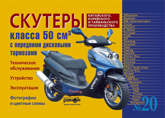 В настоящем издании рассматриваются скутеры китайского, корейского и тайваньского производства, оснащенные карбюраторными четырехтактными двигателями воздушного охлаждения объемом 50 куб. см. с передними дисковыми тормозами. Издание адресуется владельцам скутеров. Производители данных моделей скутеров постоянно вносят изменения во внешний вид и комплектацию. Поэтому некоторые данные могут не соответствовать Вашему скутеру.