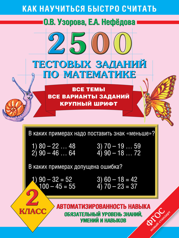 Пособие содержит тестовые задания по всем основным темам курса математики для 2 класса. Впервые для каждой изученной темы предложены тесты, позволяющие проверить, как ученик её усвоил. При помощи тестов осуществляются закрепление и проверка полученных знаний, чётко выявляются «слабые места». Данные тесты с первого класса готовят ребёнка к последующим тестовым испытаниям, в том числе к ГИА и ЕГЭ. Если ребёнок учится не по традиционной программе, использование этих тестов становится особенно актуальным, поскольку некоторые новаторские программы не уделяют достаточного внимания базовому материалу. Однако без прочного усвоения базовых знаний невозможно полноценное обучение математике, к тому же именно базовые знания нужны для успешной сдачи экзаменов. Любое обучение наиболее эффективно тогда, когда оно приносит радость. Как этого добиться? Главное средство – знать предмет как можно лучше. Чем лучше ребёнок учится, тем приятнее ему учиться. Поэтому использование данных тестов – это шаг не только к более глубоким и полным знаниям, но и к отличному интеллектуальному развитию, к способности получать удовольствие от учебного процесса. Тесты можно использовать в государственных и частных школах на уроках математики для проверки знаний, а также дома для индивидуальной работы.
