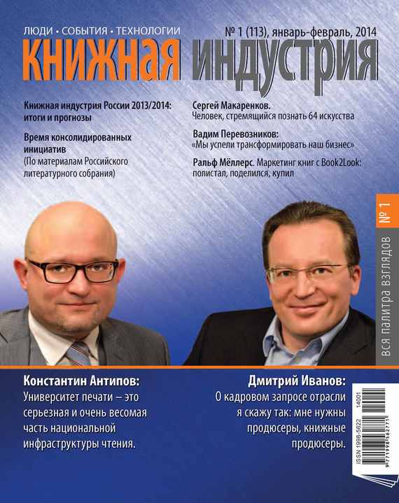 Как и в любой профессии, для успеха в издательском бизнесе недостаточно просто любить книги. Книгоиздатель, как и организатор книжной торговли, – это набор уникальных компетенций, приобрести которые можно, лишь освоив соответствующие учебные курсы в единственном в своем роде вузе РФ. Светлана Зорина , главный редактор «КИ», в рубрике «Диалоги» беседует с уважаемыми экспертами: Дмитрием Николаевичем Ивановым , генеральным директором компании «Олма Медиа Групп», и Константином Валерьевичем Антиповым , ректором Московского государственного университета печати им. Ивана Федорова. «Тема номера»: «Книжная индустрия России 2013/2014: итоги и прогнозы». 2013 год был разным – и хорошим, и плохим в меру, а 2014‑й – не только год Олимпиады в Сочи, но и Год культуры, что для книжников гораздо важнее. И, как обычно, находясь на точке встречи прошлого и будущего, подводя итоги и строя прогнозы, сегодня мы попытаемся понять главное и сделать выводы, дабы с уверенностью двигаться вперед. Участники дискуссии: О. Е. Новиков , генеральный директор издательств «Эксмо» и «АСТ», Н. И. Михайлова , генеральный директор ОЦ «Московский Дом Книги», президент Ассоциации книгораспространителей независимых государств, Б. С. Есенькин, президент ТД «Библио-Глобус», президент НП «Гильдия книжников», Б. В. Кузнецов, генеральный директор издательства «РОСМЭН», К. В. Чеченев , генеральный директор издательства «Белый город», президент АСКИ, А. В. Альперович , генеральный директор издательства «Клевер Медиа Групп», М. В. Иванцов , генеральный директор объединенной розничной сети «Новый Книжный – Буквоед», А. М. Ильин , генеральный директор ИГ «Альпина Паблишер», Л. В. Шкурович , генеральный директор ИГ «Азбука-Аттикус», С. В. Анурьев , генеральный директор компании «ЛитРес», А. А. Кузменко , руководитель книжного департамента OZON.ru, Т. П. Ларина , коммерческий директор книготорговой компании «Амиталь». Постоянные разговоры о закате бумажной эры не могут не беспокоить тех, чей бизнес строи