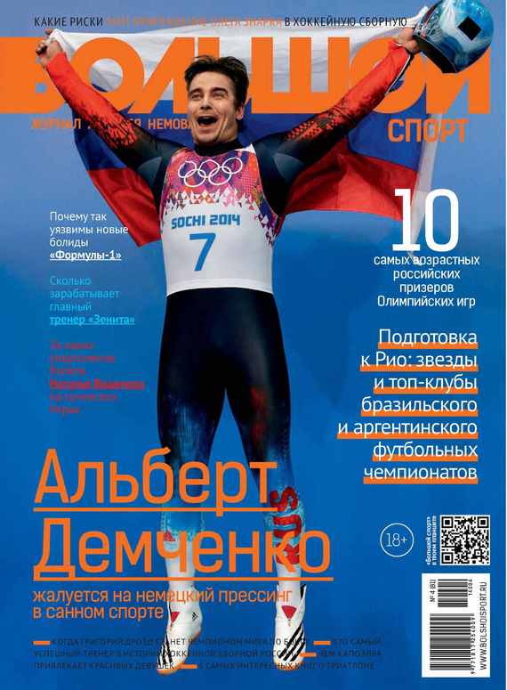«Большой спорт» – мужской журнал нового формата, предлагающий совершенно особый взгляд на мировую спортивную индустрию: под политическим и экономическим углами зрения. Спорт и власть, спорт и деньги, спорт и стиль – таковы тематические приоритеты журнала. В номере: По ту сторону Атлантики Чемпионаты Бразилии и Аргентины, воспитавшие Марадону и Пеле, Гарринчу и Ди Стефано, Роналдо и Батистуту, Неймара и Месси, малопопулярны в российских широтах. Столкнувшись с дефицитом информации о лучших чемпионатах Южной Америки, мы решили хотя бы частично восполнить информационный вакуум Аксакал Главный редактор «Большого спорта» Алексей Немов побеседовал с двукратным серебряным призером Олимпиады в Сочи Альбертом Демченко. 42-летний саночник, для которого домашние Игры стали уже седьмыми в карьере, рассказал о своей системе подготовки, общей ситуации в мировом санном спорте и планах на жизнь после ухода из спорта, который, правда, состоится еще не скоро Порох в пороховницах Порывшись в биографиях всех медалистов-зимников суверенной России, мы выбрали десятку самых возрастных призеров и решили напомнить читателям об их достижениях Попрыгунья На Играх в Сочи дебютировал женский хафпайп во фристайле, где второе место заняла француженка Мари Мартино, которая еще в 2007-м объявила о завершении карьеры. О причинах своего возвращения, впечатлениях от Сочи-2014 и французском фристайле именитая спортсменка рассказала журналу Неоднозначность Знарка Пользуясь взятой Федерацией хоккея России паузой, мы попытались оценить основные плюсы и минусы прихода Олега Знарка в сборную России Главные С 1992 года пост главного тренера хоккейной сборной России занимали 11 специалистов. Мы проанализировали результаты национальной команды под руководством всех ее наставников и выяснили, кто из них должен войти в историю как наиболее успешный Полет Дрозда О том, кого хочет побить в матче за титул, почему не оправдал надежд его бывший промоутер Владимир Хрюнов и какие отношения сложились с владельцем «Мир