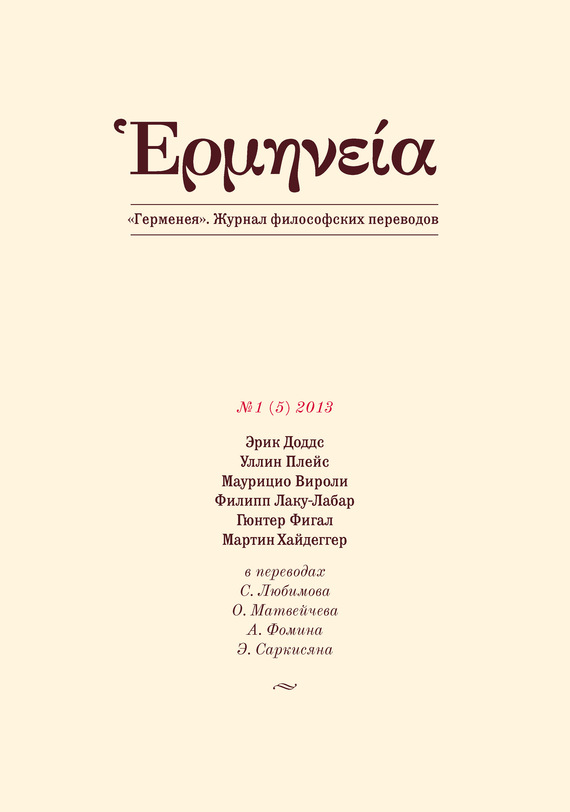 «Герменея» – журнал философских переводов отдельных статей, отрывков из книг или цельных работ классиков истории философии и современных авторов. В номере: Э. Доддс. «Парменид» Платона и происхождение неоплатонического Единого (Перевод С. Любимова) У. Плейс. Является ли сознание процессом в мозге? (Перевод С. Любимова) М. Вироли. Макиавелли и религия virtue (Перевод С. Любимова) Ф. Лаку-Лабар. Трансценденция заканчивается в политике (Перевод О. Матвейчева) Г. Фигал. Хайдеггер как последователь Аристотеля (Перевод А. Фомина) М. Хайдеггер. Подачи (Перевод Э. Саркисяна)