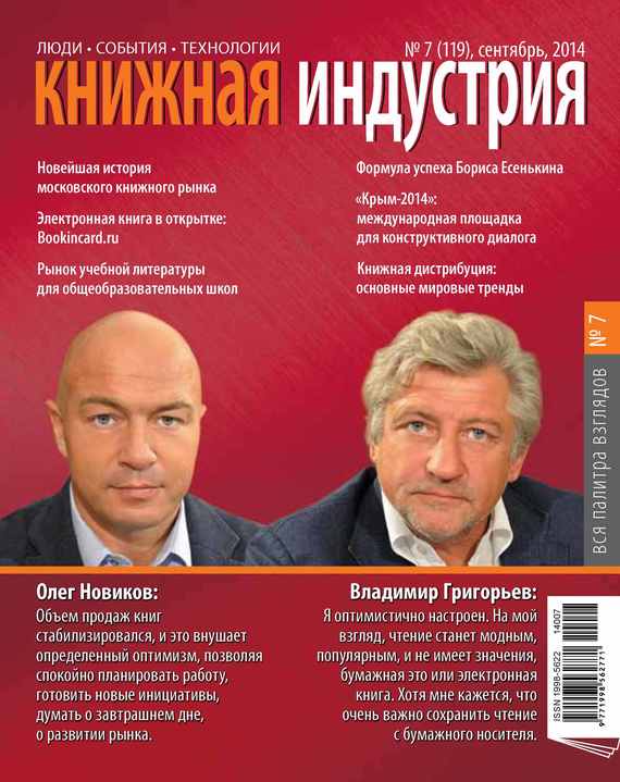 дит в онлайн, при этом оставаясь в нашем сознании «лучшим» подарком. О том, как совместить эти две сущности книги, использовав лучшее из обоих – виртуального и материального – миров, рассказывают авторы стартапа Bookincard.ru Олег Вавилов и Владимир Харитонов в рубрике «Электронная книга». В этой же рубрике читайте статью Алены Сосниной о том, каким образом адаптировать книгу под мобильные устройства. 9–10 июля в Казани прошла 8-я конференция издателей «Повышение конкурентоспособности регионального книгоиздания». Собралась представительная аудитория издателей и книгораспространителей из 23 городов – Москвы, Санкт-Петербурга, Архангельска, Воронежа, Петрозаводска, Нальчика, Махачкалы, Уфы, Екатеринбурга, Ижевска, Чебоксар, Йошкар-Олы, Нижнего Новгорода, Астрахани, Саратова, Якутска, Тобольска, Феодосии, Сыктывкара, Кирова, Рязани, Грозного. Читайте материал в рубрике «Крупный план». О Поправках в закон «О библиотечном деле», касающихся доступа к Интернету в библиотеках, читайте в рубрике «Библиотеки» . 21-я Международная конференция «Крым», несмотря на сложности политической ситуации, тем не менее состоялась и прошла успешно. Этому способствовало прежде всего большое желание крымских и российских библиотек, органов исполнительной власти, ведающих вопросами культуры и образования. Читайте материал в рубрике «Выставки. Конференции» . В рубрике «Аналитика рынков» приведен подробный отчет о рынке учебной литературы для общеобразовательных школ. Рубрика «За рубежом» посвящена кровеносной системе книжного бизнеса – каналам продаж. Разговор о современной системе распространения невозможно вести без упоминания Amazon’а: название компании неизбежно появляется при любом обсуждении книготорговых стратегий. Кто сказал, что в одну и ту же реку нельзя войти дважды? В середине августа заработал в бета-режиме книжный онлайн-ритейлер Best Little Bookshop, основателем которого стал Кирон Смит , который любезно согласился ответить на несколько вопросов «КИ». В этой же рубрике читайте подробности отчета Globa