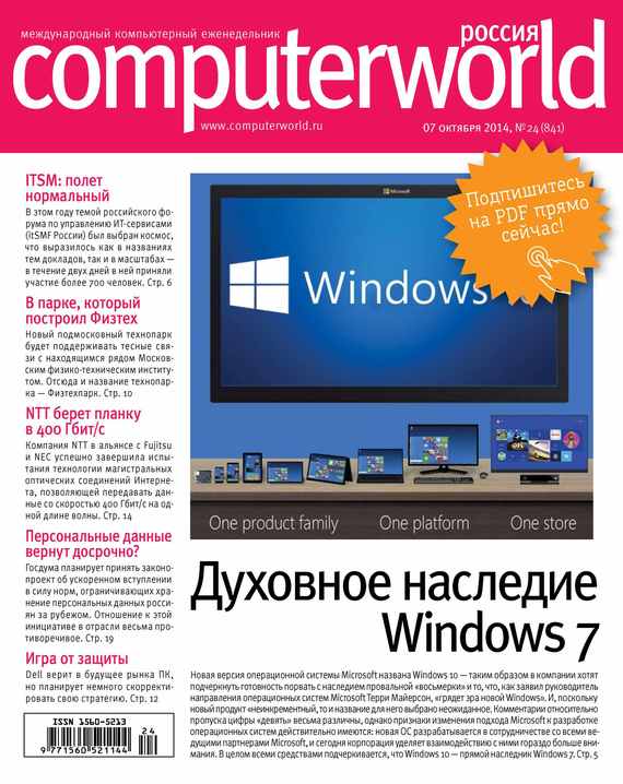 Computerworld Россия – ведущий международный еженедельник, посвященный информационным технологиям. В журнале вы найдете обзор важнейших событий ИТ-индустрии в России и в мире, материалы о новых технологиях. В номере: Духовное наследие Windows 7 Новая версия операционной системы Microsoft названа Windows 10 – таким образом в компании хотят подчеркнуть готовность порвать с наследием провальной «восьмерки» и то, что, как заявил руководитель направления операционных систем Microsoft Терри Майерсон, «грядет эра новой Windows». И, поскольку новый продукт «неинкрементный», то и название для него выбрано неожиданное. Комментарии относительно пропуска цифры «девять» весьма различны, однако признаки изменения подхода Microsoft к разработке операционных систем действительно имеются: новая ОС разрабатывается в сотрудничестве со всеми ведущими партнерами Microsoft, и сегодня корпорация уделяет взаимодействию с ними гораздо больше внимания. В целом всеми средствами подчеркивается, что Windows 10 – прямой наследник Windows 7. ITSM: полет нормальный В этом году темой российского форума по управлению ИТ-сервисами (itSMF России) был выбран космос, что выразилось как в названиях тем докладов, так и в масштабах – в течение двух дней в ней приняли участие более 700 человек. В парке, который построил Физтех Новый подмосковный технопарк будет поддерживать тесные связи с находящимся рядом Московским физико-техническим институтом. Отсюда и название технопарка – Физтехпарк. NTT берет планку в 400 Гбит/с Компания NTT в альянсе с Fujitsu и NEC успешно завершила испытания технологии магистральных оптических соединений Интернета, позволяющей передавать данные со скоростью 400 Гбит/с на одной длине волны. Персональные данные вернут досрочно? Госдума планирует принять законопроект об ускоренном вступлении в силу норм, ограничивающих хранение персональных данных россиян за рубежом. Отношение к этой инициативе в отрасли весьма противоречивое. Игра от защиты Dell верит в будущее рынка ПК, но