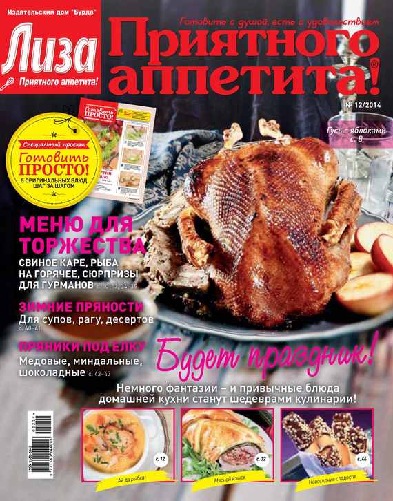 «Лиза. Приятного аппетита!» – журнал для тех, кто любит готовить, печь и радовать своих близких кулинарными сюрпризами. Издание предлагает яркий аппетитный мир всем, для кого готовить – радость, а есть – удовольствие. Это журнал, целиком посвященный только одной теме – домашней кулинарии. На страницах издания – лучшие рецепты русской кухни и самое вкусное со всего света, рекомендации по приготовлению традиционных и экзотических блюд, советы и секреты. Эффектный и несложный в исполнении, каждый рецепт журнала может стать «фирменным» для любителя готовить дома. В журнале «Лиза. Приятного аппетита!» – рецепты от звезд, обеды для всей семьи, новинки из магазинов, аппетитные новости, школа поварят. В каждом номере – специальное приложение: журнал в журнале «Готовить просто!» с пошаговыми инструкциями по приготовлению пяти самых популярных блюд. В номере: Обед для всей семьи Генеральная репетиция Блюда сезона Рыбка на горячее Новинки из гастронома С лучшим вкусом! Принимаем гостей Устроим пир! Кулинарное путешествие Бернские Альпы Кулинарная студия В центре внимания: коронные блюда к новогоднему столу Сладкоежкам на радость Колдовское печенье и многое другое