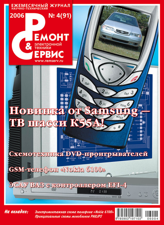 Журнал «Ремонт и сервис» – самый современный и обстоятельный журнал об электронике и домашней технике. Новинки электроники и новости сервиса, холодильники и стиральные машины, оборудование для кухни и дачи, копировальная и офисная техника, автоэлектроника, телевизионная и видеотехника, телефония GSM, измерительные приборы и ремонтное оборудование, радиоэлектронные компоненты и технологии, источники питания – всё это в доступной и понятной форме для специалистов и любителей. В номере: Телевизионная техника Обмен опытом. Восстановление телевизионных микроконтроллеров методом контролируемого нагрева Видеотехника DVD:проигрыватели «Samsung DVD709/909». Ремонт привода дисков и источника питания Телефония Ремонт GSM-телефона «Nokia 6100» Бытовая техника Устройство и ремонт керамических обогревателей Автоэлектроника Комплексная система управления бензиновым двигателем ЭСАУ-ВАЗ с контроллером ЕFI-4 (часть 2) Измерительная техника. Оборудование Аналоговые осциллографы широкого применения и многое другое