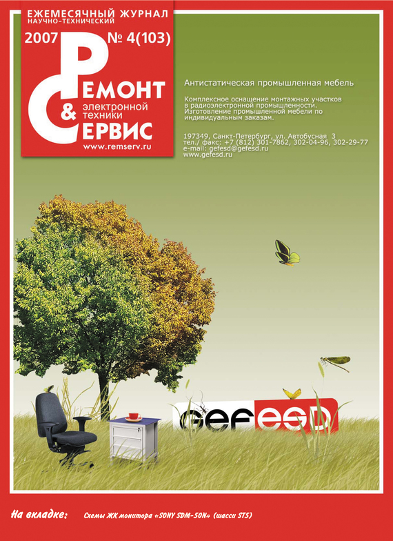 Журнал «Ремонт и сервис» – самый современный и обстоятельный журнал об электронике и домашней технике. Новинки электроники и новости сервиса, холодильники и стиральные машины, оборудование для кухни и дачи, копировальная и офисная техника, автоэлектроника, телевизионная и видеотехника, телефония GSM, измерительные приборы и ремонтное оборудование, радиоэлектронные компоненты и технологии, источники питания – всё это в доступной и понятной форме для специалистов и любителей. В номере: Телевизионная техника Из опыта ремонта: неочевидные неисправности телевизоров Видеотехника DVD-проигрыватель, совмещенный с видеомагнитофоном «JVC-HR-XV1EK/EU/MS». Диагностика неисправностей в каналах изображения и звука (часть 1) Телефония Инженерное программирование сотовых телефонов Samsung SGH на базе платформы VLSI Оргтехника Ремонт ЖК монитора «SONY SDM-50N» (шасси ST5) Бытовая техника Программирование энергонезависимой памяти современных стиральных машин Автоэлектроника Эксплуатационные показатели автомобильных аккумуляторных батарей и многое другое
