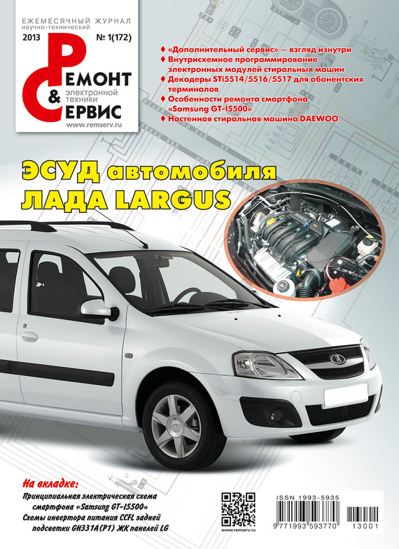 Журнал «Ремонт и сервис» – самый современный и обстоятельный журнал об электронике и домашней технике. Новинки электроники и новости сервиса, холодильники и стиральные машины, оборудование для кухни и дачи, копировальная и офисная техника, автоэлектроника, телевизионная и видеотехника, телефония GSM, измерительные приборы и ремонтное оборудование, радиоэлектронные компоненты и технологии, источники питания – всё это в доступной и понятной форме для специалистов и любителей. В номере: Телевизионная техника Телевизор «SAMSUNG CW29Z408PQXXEC» на шасси S63A(Р)/В). Сервисные регулировки и типовые неисправности Видеотехника STi5514, STi5516 и STi5517 – однокристальные декодеры для цифровых абонентских ТВ терминалов Телефония и мобильные технологии Ремонт смартфона «Samsung GT-I5500» Оргтехника Методика заправки картриджа HP Q6511A/X Бытовая техника Внутрисхемное программирование электронных модулей стиральных машин Indesit/Ariston Автоэлектроника Устройство и диагностика ЭСУД автомобиля Lada Largus (часть 1) и многое другое