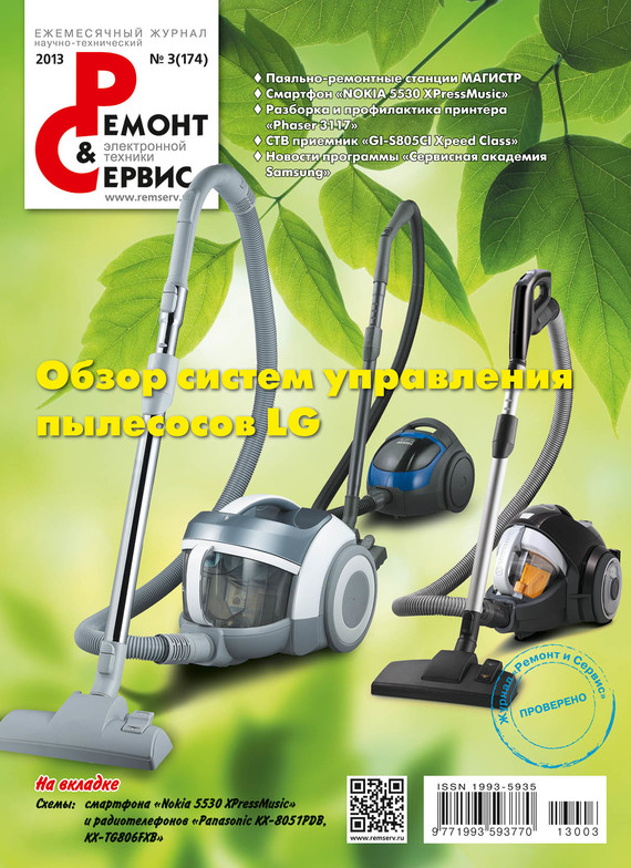 Журнал «Ремонт и сервис» – самый современный и обстоятельный журнал об электронике и домашней технике. Новинки электроники и новости сервиса, холодильники и стиральные машины, оборудование для кухни и дачи, копировальная и офисная техника, автоэлектроника, телевизионная и видеотехника, телефония GSM, измерительные приборы и ремонтное оборудование, радиоэлектронные компоненты и технологии, источники питания – всё это в доступной и понятной форме для специалистов и любителей. В номере: Телевизионная техника Архитектура и сервисные регулировки телевизионного шасси PHILIPS Q522.2E LA (часть 2) Видеотехника Устройство, диагностика неисправностей и ремонт цифровых СТВ приемников «GI-S805CI Xpeed Class» Телефония и мобильные технологии Ремонт смартфона «Nokia 5530 XPressMusic» (часть 1) Оргтехника Разборка и ремонт ЖК монитора «Samsung 2333HD» на шасси LS23CFV (часть 2) Бытовая техника Эволюция систем управления пылесосов LG (часть 1) Измерительная техника. Оборудование Паяльно-ремонтные станции МАГИСТР и многое другое