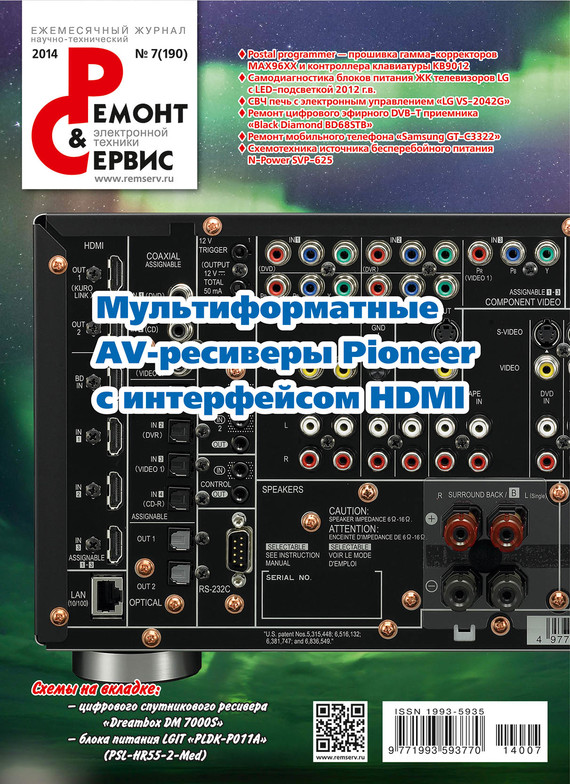 Журнал «Ремонт и сервис» – самый современный и обстоятельный журнал об электронике и домашней технике. Новинки электроники и новости сервиса, холодильники и стиральные машины, оборудование для кухни и дачи, копировальная и офисная техника, автоэлектроника, телевизионная и видеотехника, телефония GSM, измерительные приборы и ремонтное оборудование, радиоэлектронные компоненты и технологии, источники питания – всё это в доступной и понятной форме для специалистов и любителей. В номере: Телевизионная техника Postal programmer – «умный» программатор. Работа с гамма-корректором MAX96XX и контроллером клавиатуры ноутбуков KB9012 Видеотехника Устройство и ремонт цифрового эфирного DVB-T приемника «Black Diamond BD68STB» Аудиотехника Мультиформатные AV-ресиверы Pioneer с цифровым интерфейсом HDMI. Версии интерфейса HDMI и их особенности Телефония Ремонт мобильного телефона «Samsung GT-C3322» (часть 1) Оргтехника Схемотехника источника бесперебойного питания N-Power SVP-625 Бытовая техника Микроволновая печь с электронным управлением «LG VS-2042G» Измерительная техника. Оборудование Новые пробники InfiniiMax с принадлежностями QuickTip для тестирования высокоскоростных шин и многое другое