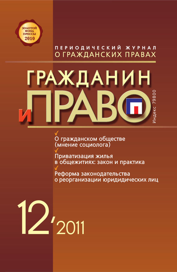 «Гражданин и право» – научно-теоретический журнал об основных правах и обязанностях граждан при урегулировании правоотношений с гражданами, организациями, а также при защите нарушенных гражданских прав в судах и других инстанциях. В журнале ведутся постоянные актуальные рубрики, охватывающие ключевые вопросы правоотношений – трудовых, финансовых, налоговых, уголовных, экологических, семейных, а также пенсионного и социального обеспечения, охраны интеллектуальной собственности, защиты прав потребителей. Издание отражает новейшие тенденции в развитии юридических наук, общества и государства, занимается популяризацией права и пропагандой общественного и юридического сознания. В номере: Защита гражданских прав Статус эмбриона в современном праве Экологическое право Криминалистические и уголовно-процессуальные проблемы при возбуждении уголовных дел о загрязнении вод Обеспечение прав собственности Приватизация жилья в общежитиях: закон и практика Дискуссия Обзор материалов международной конференции Новое в законодательстве Реформа законодательства о реорганизации юридических лиц: анализ предлагаемых изменений в ГК РФ Научные сообщения К вопросу о форме доверенности и многое другое