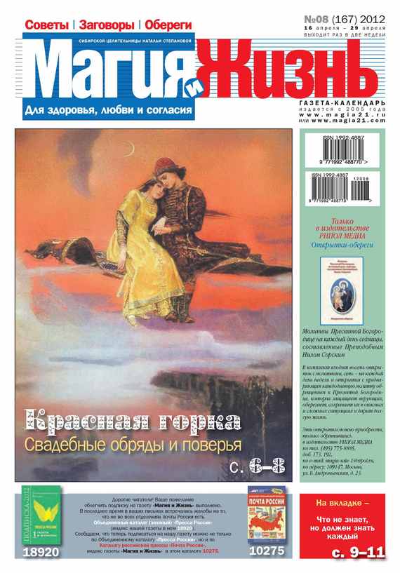 «Магия и Жизнь» – иллюстрированная газета-календарь, основанная на переписке потомственной сибирской целительницы Натальи Степановой с читателями. Это уникальное в своем роде издание, которое призвано открыть для каждого из вас вековые традиции отечественного целительства. На страницах издания Наталья Ивановна знакомит с приметами, заговорами, оберегами для здоровья и удачи, для любви и согласия, советует, как избавиться от болезней и пороков, рассказывает об отечественных традициях и обычаях, о гаданиях, о белой и черной магии и о многом, многом другом. «Магия и Жизнь» – ваша уверенность, ваша защита, ваш успех!