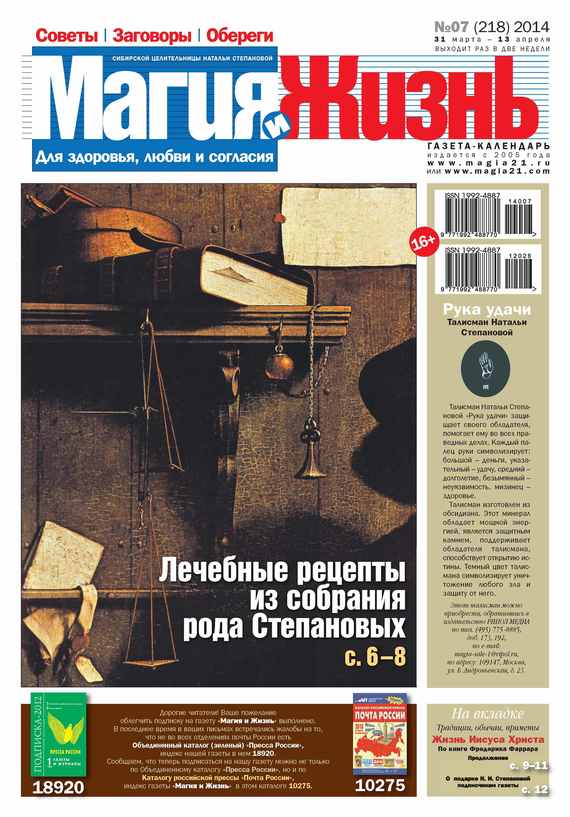 «Магия и Жизнь» – иллюстрированная газета-календарь, основанная на переписке потомственной сибирской целительницы Натальи Степановой с читателями. Это уникальное в своем роде издание, которое призвано открыть для каждого из вас вековые традиции отечественного целительства. На страницах издания Наталья Ивановна знакомит с приметами, заговорами, оберегами для здоровья и удачи, для любви и согласия, советует, как избавиться от болезней и пороков, рассказывает об отечественных традициях и обычаях, о гаданиях, о белой и черной магии и о многом, многом другом. «Магия и Жизнь» – ваша уверенность, ваша защита, ваш успех!