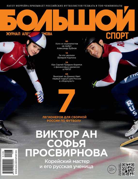 «Большой спорт» – мужской журнал нового формата, предлагающий совершенно особый взгляд на мировую спортивную индустрию: под политическим и экономическим углами зрения. Спорт и власть, спорт и деньги, спорт и стиль – таковы тематические приоритеты журнала. В номере: Уходящая натура Корреспондент и фотограф «Большого спорта» отправились в Мытищи, чтобы увидеть поединок «Атланта» и Slovan – команд, для которых нынешний сезон в Континентальной хоккейной лиге может оказаться последним Главный по РФПЛ Президент Российской футбольной премьер-лиги Сергей Прядкин рассказывает о работе возглавляемой им организации в непростых экономических условиях, ситуации с телевизионными трансляциями матчей и разрабатываемой стратегии развития Молодежь наступает Хоккеист московского «Динамо» и молодежной сборной России Владимир Брюквин повествует о том, как сыграть достойно на первенстве мира, и о своей роли в клубе Мэтр и ученица Самые большие надежды на медали чемпионата мира по шорт-треку мы связываем с лидерами команды Виктором Аном и Софьей Просвирновой. Именно они стали героями фотопроекта журнала «Большой спорт» Ключ на старт Что? Где? Когда? – «Большой спорт» отвечает на три сакральных вопроса о предстоящем, 66-м по счету сезоне чемпионата мира в классе «Формула-1», рассказывая про важнейшие изменения, произошедшие в Большом цирке в межсезонье Младое племя 15 марта 2015 года, в день старта первого этапа нового сезона «Формулы-1», Максу Ферстаппену исполнится 17 лет и 164 дня, и он станет самым молодым гонщиком в истории королевских гонок. Мы вспомнили, как же развивались карьеры «молодых да ранних» предшественников Ферстаппена Оторвись по полной Не прошло и 12 месяцев, как у стартовавшего в минувшем апреле Jaguar F-Type появилась обновленная версия – продажи автомобилей 2016 модельного года начинаются уже весной и многое другое