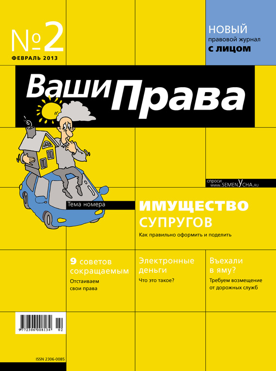 На работе, на дороге, в магазине, на отдыхе возникают ситуации, когда отсутствие правовых знаний может не просто испортить вам настроение, но и оставить без определенной суммы денег, а иногда даже без работы. Мы предлагаем материалы, подготовленные адвокатами и экспертами – профессионалами своего дела. Журнал «Ваши Права» мы создали для того чтобы рассказывать понятными словами о правовых вопросах и проблемах, с которыми приходится сталкиваться практически ежедневно. Читайте в номере: – Имущество супругов. Раздел имущества и обязательств по кредиту при расторжении брака; – 9 советов сокращаемому. Как вести себя, если на работе вам вручили уведомление о сокращении; – Деньги из компьютера. Что такое электронные деньги, и как ими пользоваться; – Въехали в яму. Кто виноват и что делать в случае повреждения автомобиля из-за некачественного дорожного покрытия? и многое другое!
