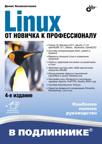 Даны ответы на все вопросы, возникающие при работе с Linux: от установки и настройки этой ОС до настройки сервера на базе Linux. Материал книги максимально охватывает все сферы применения Linux: от запуска Windows-игр под управлением Linux до настройки собственного Web-сервера. Также рассмотрены: вход в систему, работа с файловой системой, использование графического интерфейса, установка программного обеспечения, настройка сети и Интернета, работа в Интернете, средства безопасности, резервное копирование и другие вопросы. Материал ориентирован на последние версии дистрибутивов Debian, Fedora, Mandriva, openSUSE, Slackware, Ubuntu. В четвертом издании добавлены новые главы по системе безопасности Tomoyo и средствам резервного копирования, ряд глав обновлен. На сайте издательства находятся дополнительные главы в PDF-файлах, презентации установки дистрибутивов Slackware 13, Debian 4 и использования программы разметки диска diskdrake, видеоуроки по установке Debian 6, Fedora 16, openSUSE 12.1, Ubuntu 11.10, настройке входа в систему под именем root, использованию программы Remastersys, основным приемам работы с графическим редактором GIMP. Для широкого круга пользователей Linux.