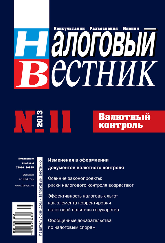 Журнал является независимым ежемесячным финансово-экономическим изданием для руководителей организаций всех форм собственности, финансистов, бухгалтеров, предпринимателей, работников финансовых, таможенных и налоговых органов. Журнал информирует о налоговом законодательстве, его изменениях и применении на практике, а также о деятельности Минфина России и ФНС России и их структурных подразделений. Читайте в номере: Указанием Банка России от 14.06.2013 № 3016-У внесены изменения в инструкцию Банка России от 04.06.2012 № 138-И «О порядке представления резидентами и нерезидентами уполномоченным банкам документов и информации, связанных с проведением валютных операций, порядке оформления паспортов сделок, а также порядке учета уполномоченными банками валютных операций и контроля за их проведением». В частности, уточнены требования к порядку заполнения справки о валютных операциях и паспорта сделки. Об этих и других изменениях читайте в рубрике «Тема номера». Не за горами долгожданные праздники. Поэтому самое время задуматься о подарках. В отличие от подарков родным и друзьям, подарки государственным служащим требуют соблюдения законодательных норм. О том, какие подарки подпадают под запрет, а какие нет, читайте в рубрике «Практикум». Также читайте в номере о взыскании неустойки, о повышении эффективности доказывания по налоговым спорам путем использования современных возможностей по применению обобщенных доказательств, об оформлении документов, подтверждающих расходы по договору транспортной экспедиции для целей налогообложения и о многом другом.