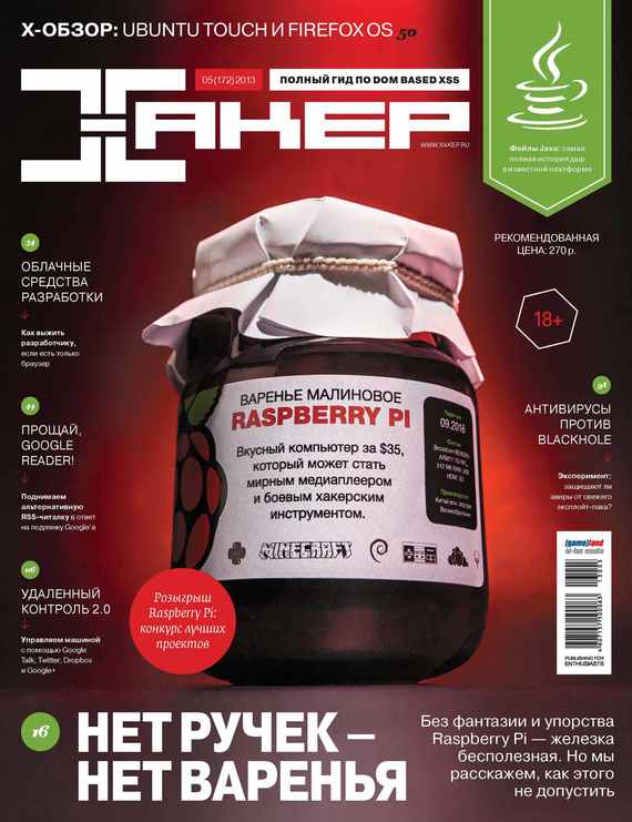 «Хакер» – это культовый журнал для тех, кто страстно увлечен современными технологиями. Для тех, кто хочет развиваться в IT или просто быть на острие. В каждом номере: подробные HOWTO, практические материалы по разработке и администрированию, интервью с выдающимися людьми, создавших технологические продукты и известные IT-компании, и, конечно, экспертные статьи о хакерстве и информационной безопасности. Мы предельно открыто пишем о существующих проблемах, рассказывая, как их могут использовать злоумышленники. При этом легкость изложения, даже невероятно сложных тем, – наш конек. У издания нет аналогов ни в России, ни в мире. В номере: Малиновый {Пирог, Питон и Пи} Raspberry Pi: как так получилось? Непобедимая Armада Нишевые друзья Raspberry Pi Работа над ошибками Поднимаем альтернативу Google Reader Easy hack Хакерские секреты простых вещей DDOS в картинках Разбираемся с цифрами по DDoS-атакам Задачи на собеседованиях Подборка интересных заданий, которые дают на собеседованиях Колыбель облаков Пошаговое руководство по развертыванию IaaS-сервиса на базе OpenNebula и многое другое