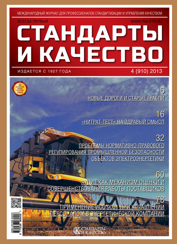 «Стандарты и качество» – старейший научно-технический и экономический журнал России для профессионалов в области стандартизации и управления качеством. Издание последовательно и обстоятельно рассказывает на своих страницах о новейших формах и методах управления качеством в России и странах СНГ. Издаётся с 1927 г. В номере: – Новые дороги и старые грабли – «Нитрат-тест» на здравый смысл – Проблемы нормативно-правового регулирования промышленной безопасности объектов электроэнергетики – Аудит как механизм оценки и совершенствования работы поставщиков – Применение стандарта ИСО 9001 при управлении персоналом в энергетической компании и многое другое!