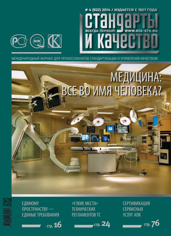 «Стандарты и качество» – старейший научно-технический и экономический журнал России для профессионалов в области стандартизации и управления качеством. Издание последовательно и обстоятельно рассказывает на своих страницах о новейших формах и методах управления качеством в России и странах СНГ. Издаётся с 1927 г. В номере: – Медицина: все во имя человека? – Единому пространству – единые требования – «Узкие места» технических регламентов Таможенного союза – Сертификация сервисных услуг АПК и многое другое!