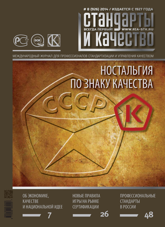 «Стандарты и качество» – старейший научно-технический и экономический журнал России для профессионалов в области стандартизации и управления качеством. Издание последовательно и обстоятельно рассказывает на своих страницах о новейших формах и методах управления качеством в России и странах СНГ. Издаётся с 1927 г. В номере: – Ностальгия по Знаку качества – Об экономике, качестве и национальной идее – Новые правила игры на рынке сертификации – Профессиональные стандарты в России и многое другое!