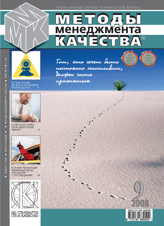 Журнал «Методы менеджмента качества» является пропагандистом и организатором развертывания в России передовых систем управления. Межотраслевой ежемесячный журнал для профессионалов по качеству. Год основания – 1969. Для многих успешных руководителей журнал давно стал настольной книгой, помогающей в повседневной деятельности, вовремя подбрасывающей свежие идеи и помогающей выбрать нужное направление. В номере: – На чьих плечах держится бережливое производство? – Усовершенствуйте свои аудиторские навыки – Условия реализации взаимовыгодных отношений с поставщиками и многое другое!