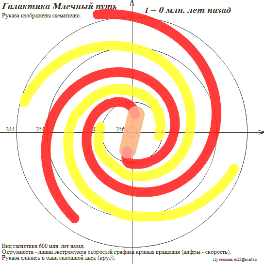 Этот кадр анимации соответствует повороту галактики Млечный Путь в прошлое на 167 млн. лет. Картина, как и ожидалось, получилась довольно странная. Видно, что рукава при обратном вращении галактики в определенной степени распрямились и даже начали закручиваться в обратную сторону. Если принять во внимание все четыре рукава, то они образовали своеобразный крест. В дальнейшем это обстоятельство мы рассмотрим подробнее. Заметим, что эта картина соответствует состоянию рукавов галактики Млечный Путь всего половину оборота назад.